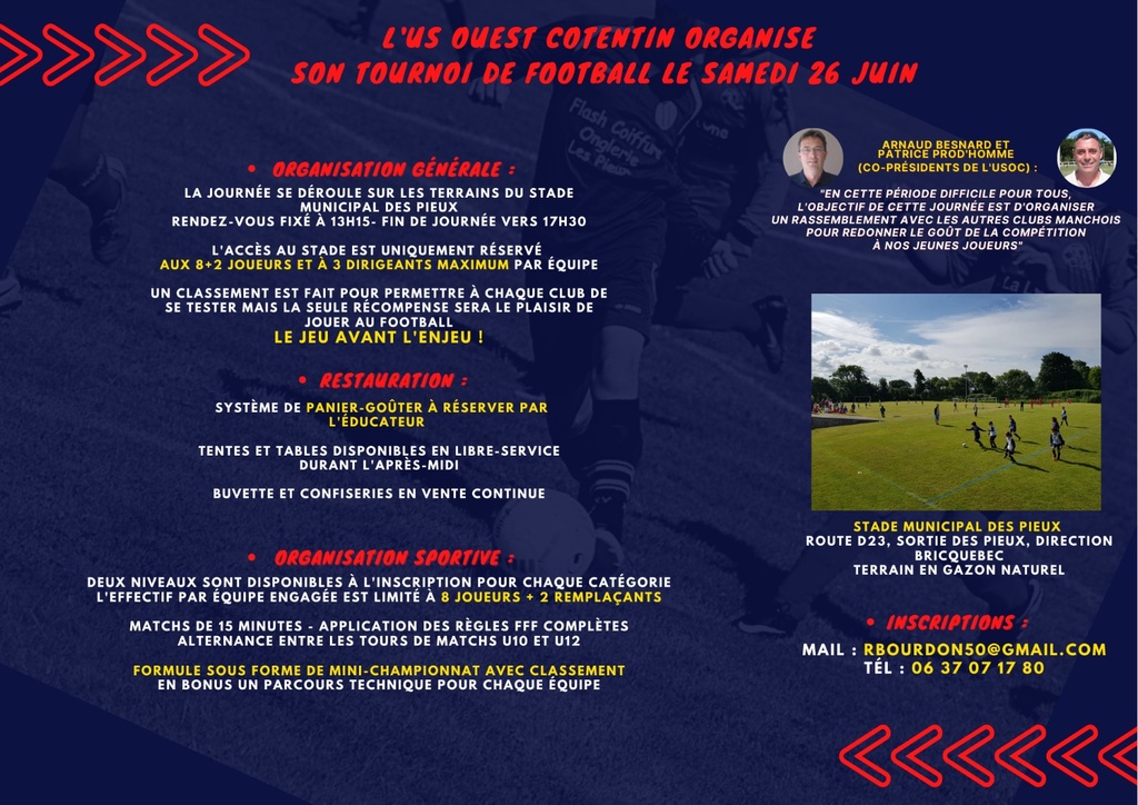 Important Seul le parent accompagnateur assurant le transport sera autorisé à entrer dans la stade. Prévoir la gourde individualisée. Plateau à 4 équipes réservé aux U10. Un gouter sera offert par ouest cotentin |