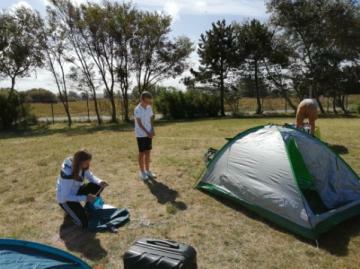 Arrivée au camping, montage des tentes sous le soleil et dans la bonne humeur.